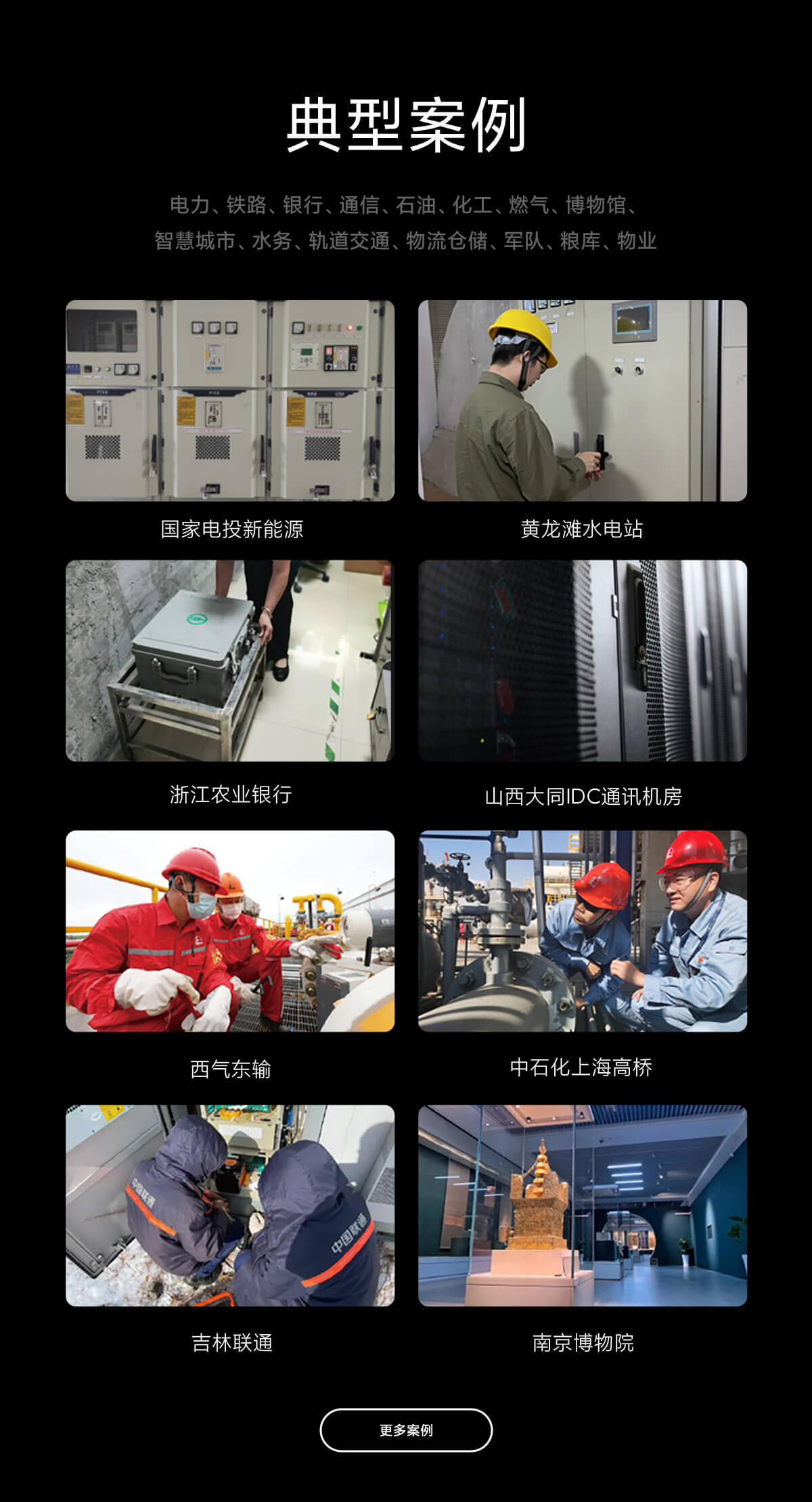 电力、铁路、银行、通信、石油、化工、燃气、博物馆、 智慧城市、水务、轨道交通、物流仓储、军队、粮库、物业