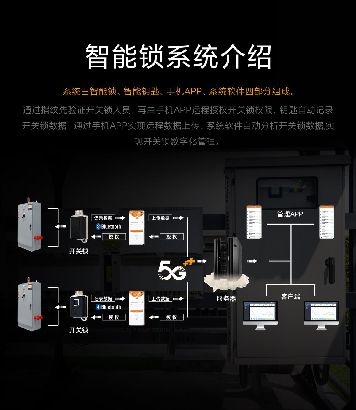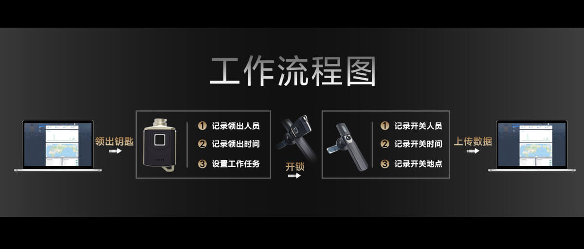 通过指纹先验证开关锁人员,再由手机APP远程授权开关锁权限,钥匙自动记录开关锁数据,通过手机APP实现远程数据上传,系统软件自动分析开关锁数据。实现开关锁数字化管理