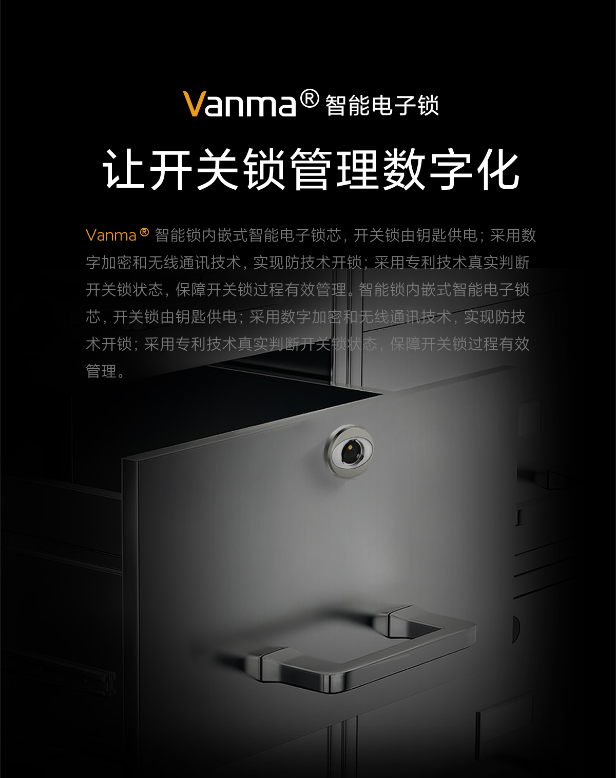 Vanma®智能锁内嵌式智能无源电子锁芯,开关锁由钥匙供电;采用数字加密和无线通讯技术,实现防技术开锁;采用专利技术真实判断开关锁状态,保障开关锁过程有效管理。