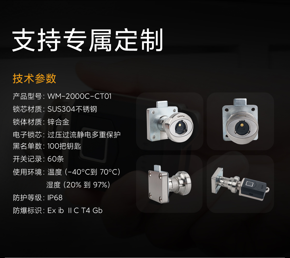 产品型号:WM-2000C-CT01 锁体材质:SUS304不锈钢 锁体材质:锌合金 电子锁芯:过压过流静电多重保护 黑名单数:100把钥匙 开关记录:60条 使用环境:温度(-40°C到 70°C)湿度(20% 到 97%) 防护等级:IP68 防爆标识:Ex ib ⅡC T4 Gb 重量:177g