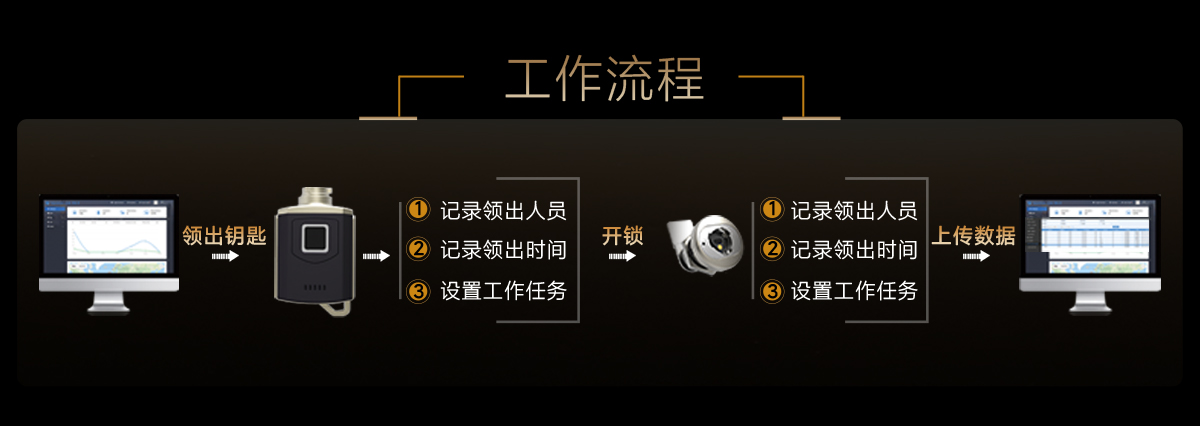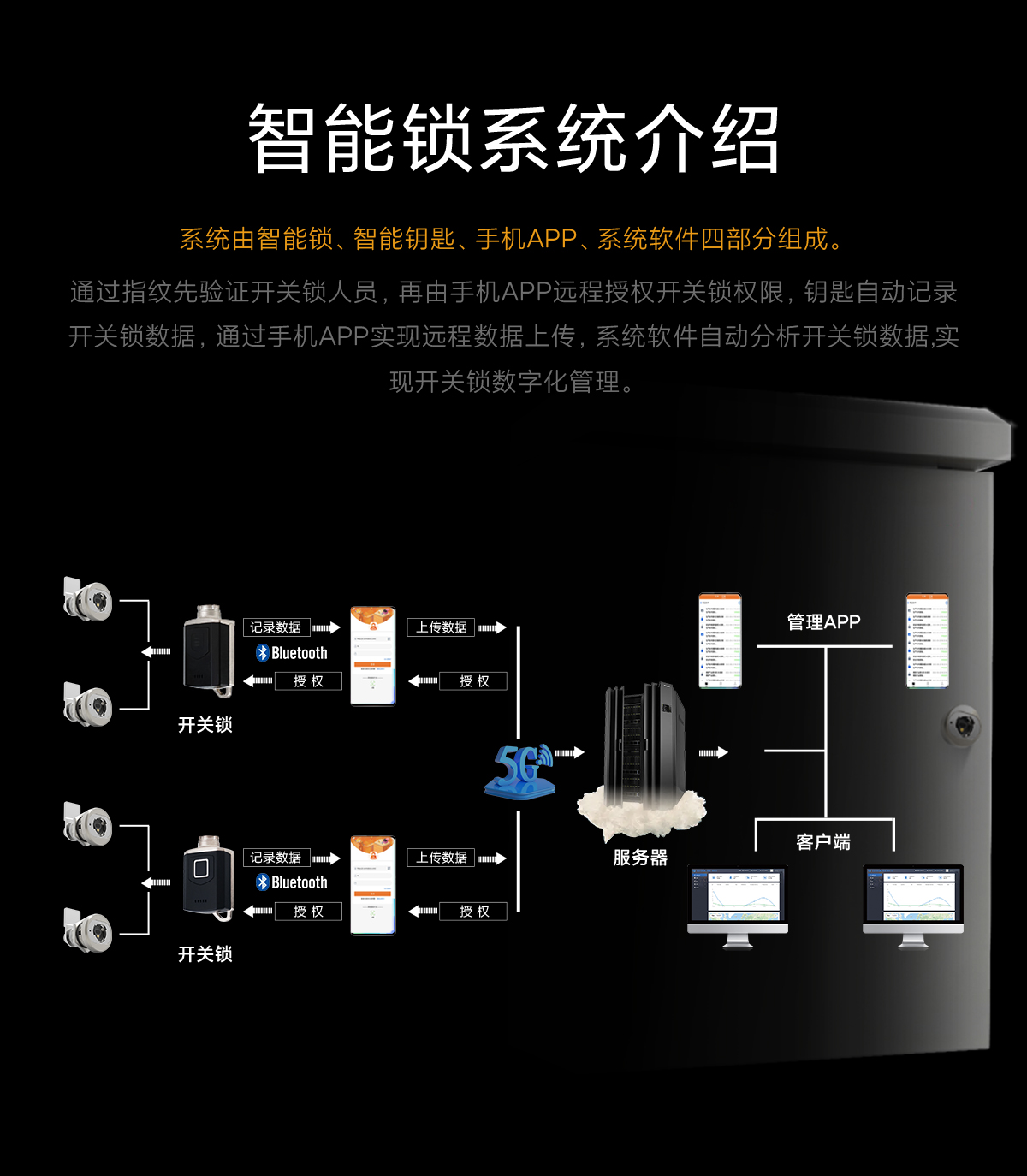 通过指纹先验证开关锁人员,再由手机APP远程授权开关锁权限,钥匙自动记录开关锁数据,通过手机APP实现远程数据上传,系统软件自动分析开关锁数据。实现开关锁数字化管理。