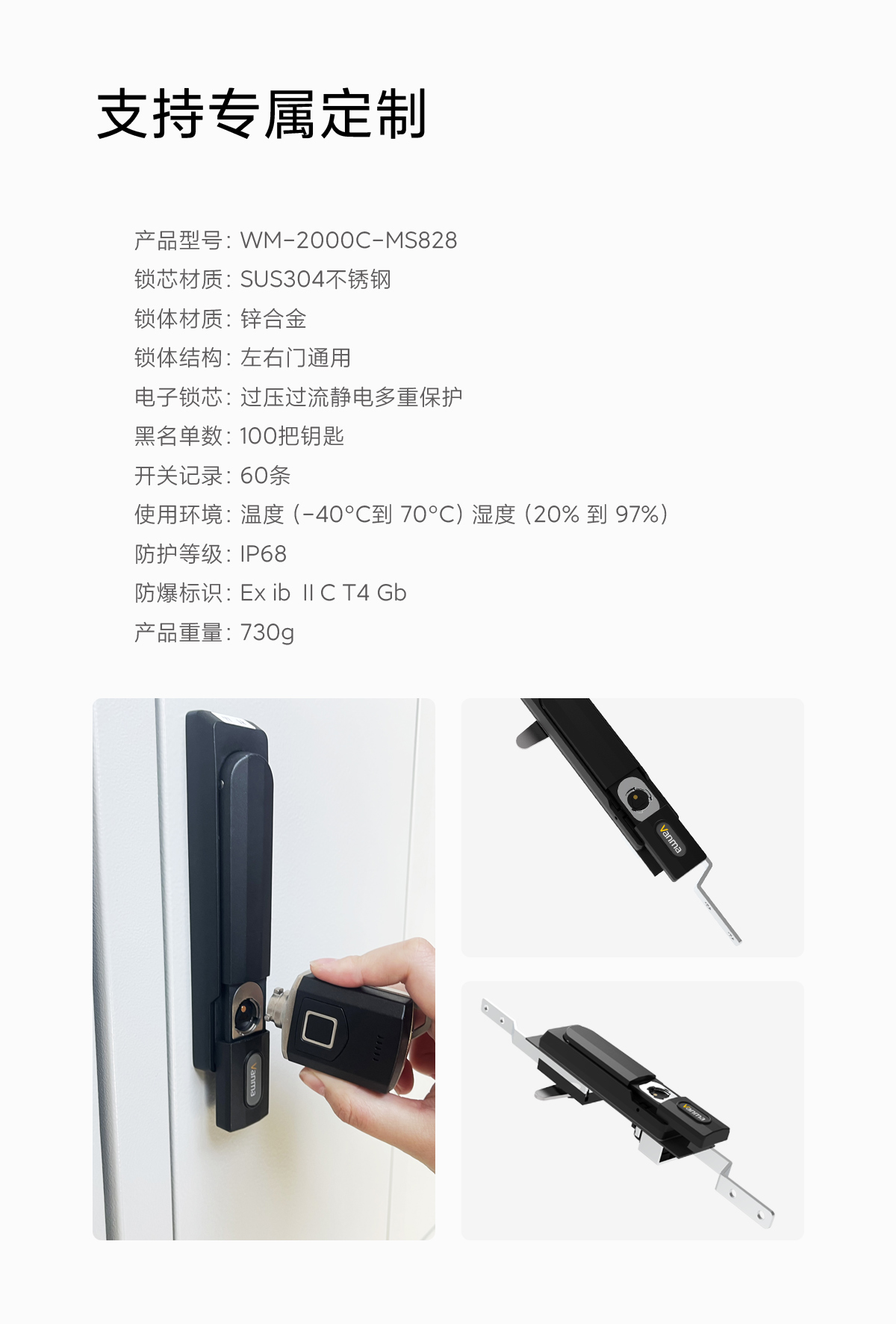 产品型号:WM-2000C-MS828 锁芯材质:SUS304不锈钢 锁体材质:锌合金 电子锁芯:过压过流静电多重保护 事件记录:60条 黑名单数:100把钥匙 使用环境:温度(-25°C到 70°C)湿度(20% 到 95%) 防护等级:IP68 重量:730g 防爆标识:Ex ib ⅡC T4 Gb