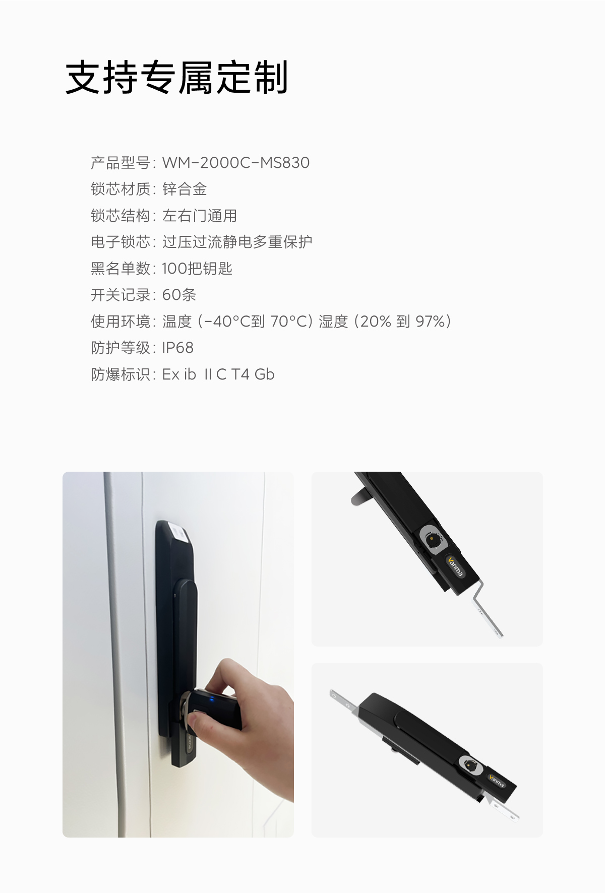 产品型号:WM-2000C-MS830 锁芯材质:SUS304不锈钢 锁体材质:锌合金 锁体结构:左右门通用 电子锁芯:过压过流静电多重保护 事件记录:60条 黑名单数:100把钥匙 使用环境:温度(-25°C到 70°C)湿度(20% 到 95%) 防护等级:IP68 重量:610g 防爆标识:Ex ib ⅡC T4 Gb