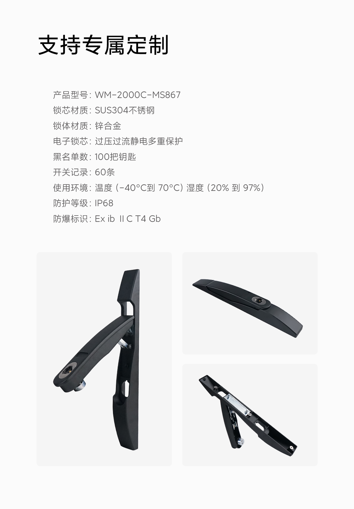 产品型号:WM-2000C-MS867 锁芯材质:SUS304不锈钢 锁体材质:锌合金 电子锁芯:过压过流静电多重保护 黑名单数:100把钥匙 开关记录:60条 使用环境:温度(-25°C到 70°C)湿度(20% 到 95%) 防护等级:IP68 防爆标识:Ex ib ⅡC T4 Gb