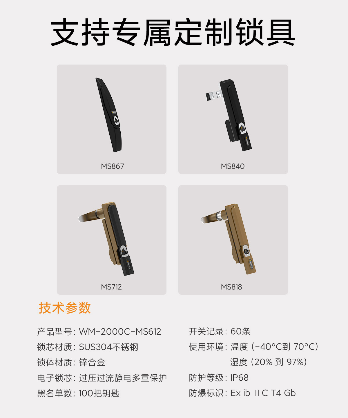 产品型号:WM-2000C-MS612 锁芯材质:SUS304不锈钢 锁体材质:锌合金 电子锁芯:过压过流静电多重保护 事件记录:60条 黑名单数:100把钥匙 使用环境:温度(-25°C到 70°C)湿度(20% 到 95%) 防护等级:IP68 防爆标识:Ex ib ⅡC T4 Gb