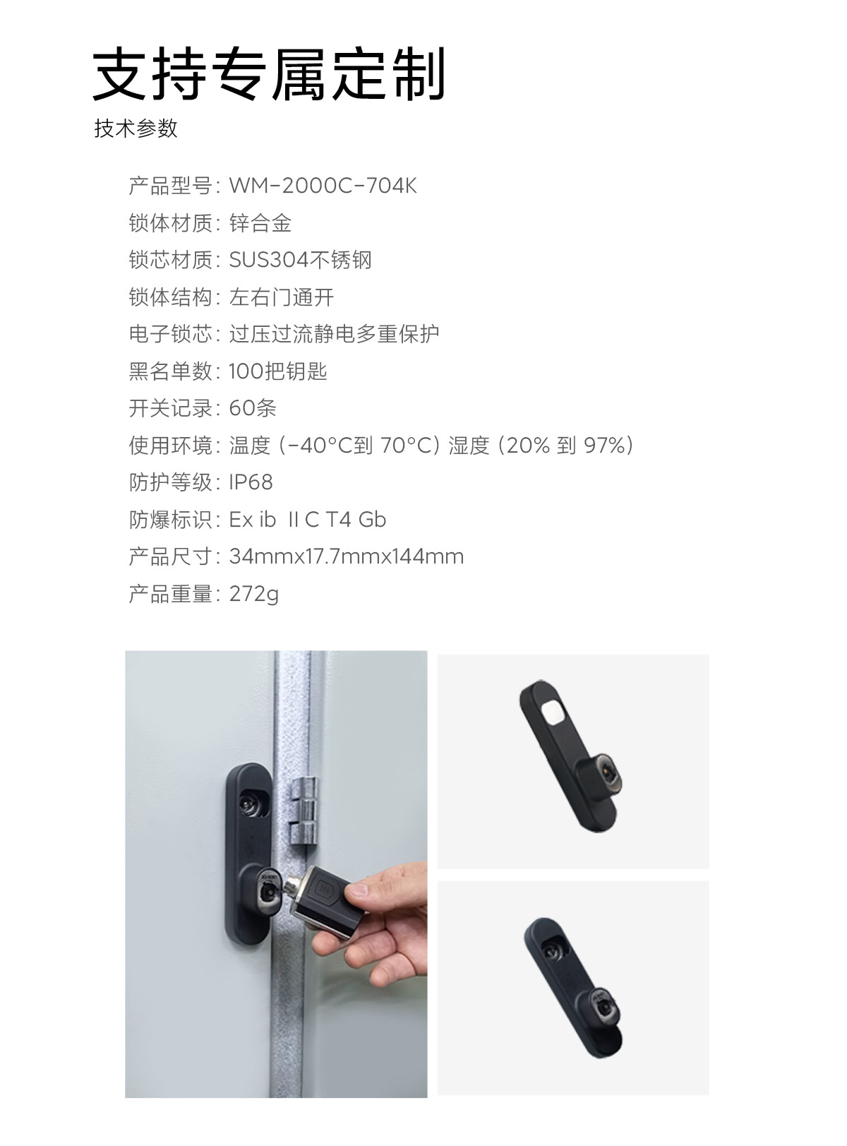 产品型号:WM-2000C-704K 锁体材质:锌合金 锁芯材质:SUS304不锈钢 锁体结构:左右门通开 电子锁芯:过压过流静电多重保护 黑名单数:100把钥匙 开关记录:60条 使用环境:温度(-25°C到 70°C)湿度(20% 到 95%) 防护等级:IP68 防爆标识:Ex ib ⅡC T4 Gb 产品尺寸:34mmx17.7mmx144mm 产品重量:272g