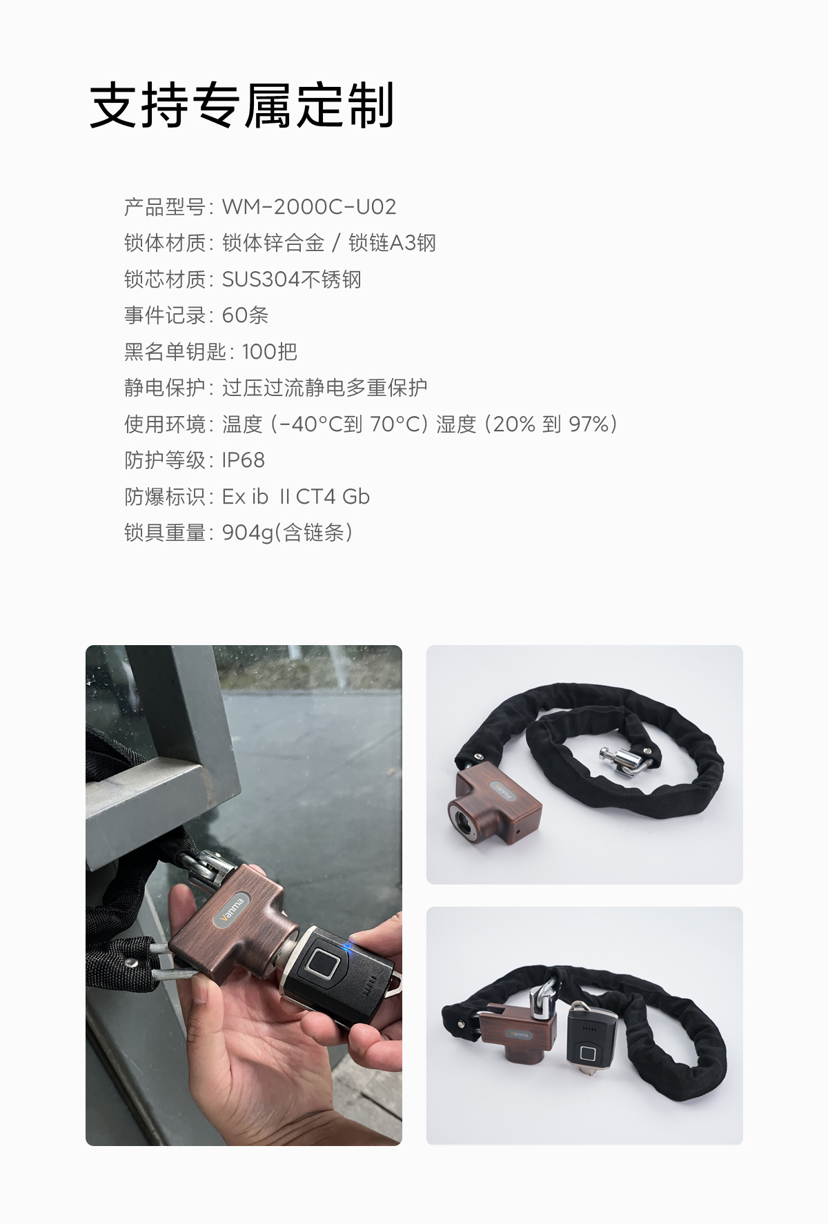产品型号:WM-2000C-U02 锁体材质:锁体锌合金/锁链A3钢 锁芯材质:SUS304不锈钢 事件记录:60条 黑名单数:100把钥匙 静电保护:过压过流静电多重保护 使用环境:温度(-25°C到 70°C)湿度(20% 到 95%) 防护等级:IP68 防爆标识:Ex ib ⅡC T4 Gb