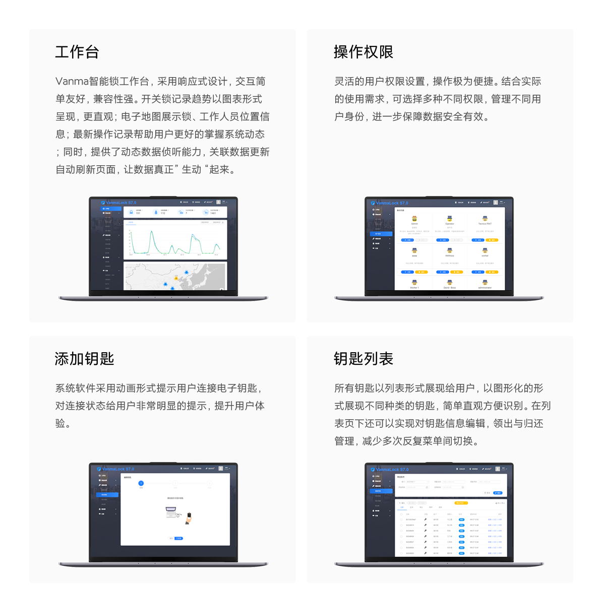Vanma智能锁工作台,采用响应式设计,交互简单友好,兼容性强。开关锁记录趋势以图表形式呈现,更直观;电子地图展示锁、工作人员位置信息;最新操作记录帮助用户更好的掌握系统动态;同时,提供了动态数据侦听能力,关联数据更新自动刷新页面,让数据真正”生动“起来。