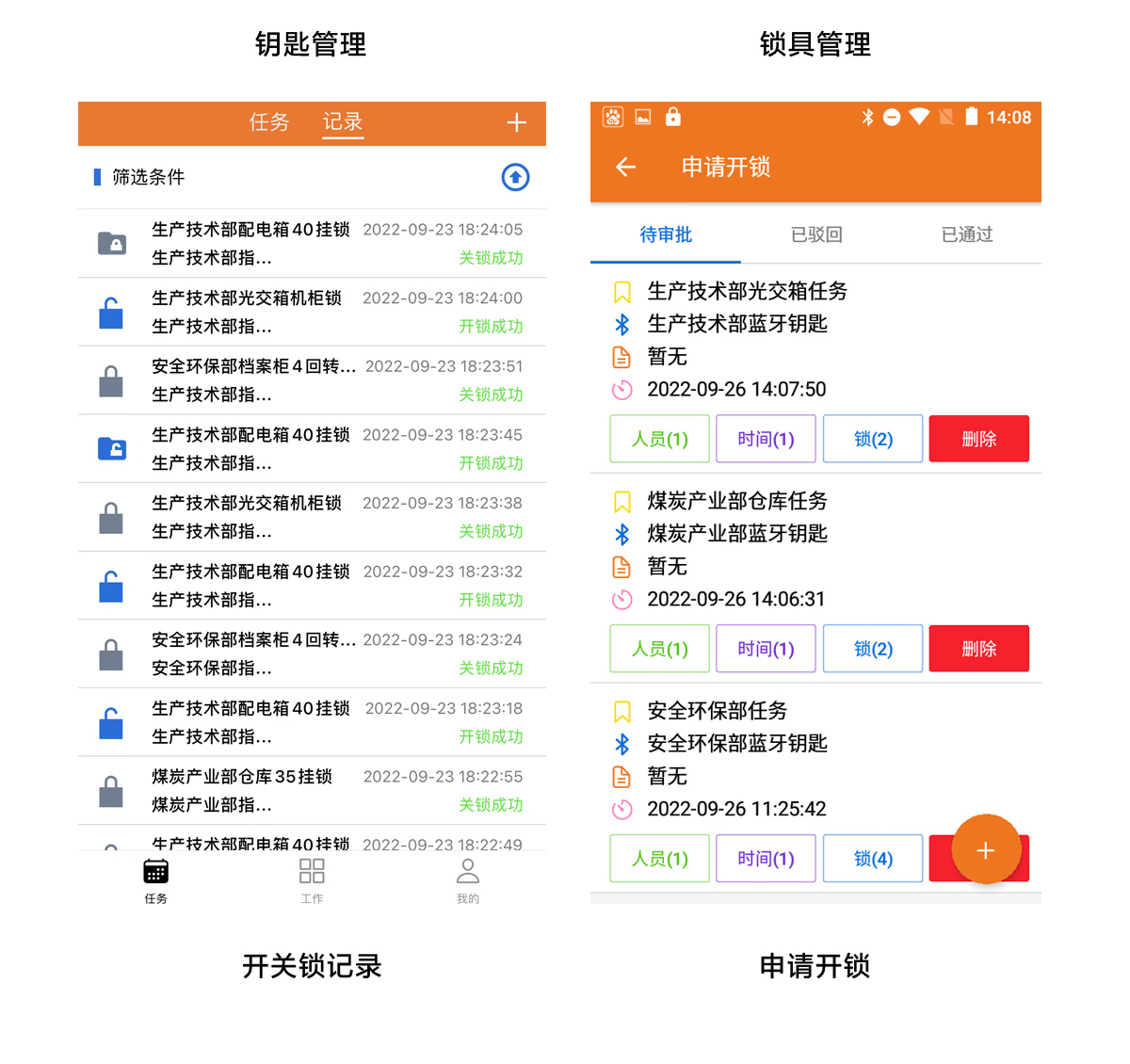 支持人脸识别登录、任务委派、任务查询、钥匙领用、钥匙归还.