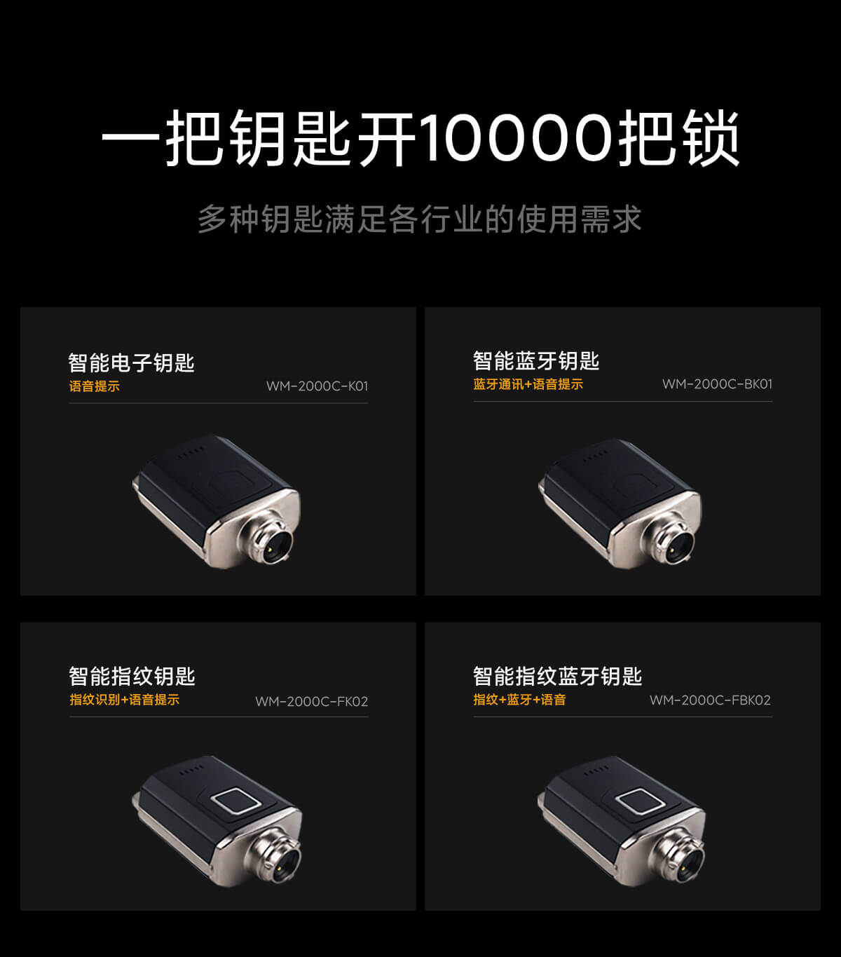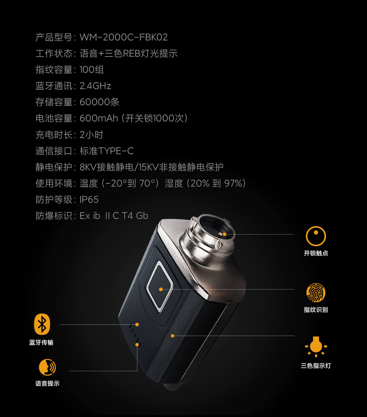 产品型号:WM-2000C-FBK02 工作状态:语音+三色REB灯光提示 指纹容量:100组 蓝牙通讯:2.4GHz 存储容量:60000条 电池容量:600mAh(开关锁1000次) 充电时长:2小时 充电接口:标准TYPE-C 静电保护:8KV接触静电/15KV非接触静电保护 使用环境:温度(-20°C到 70°C)湿度(20% 到 97%) 防护等级:IP65 防爆标识:Ex ib ⅡC T4 Gb