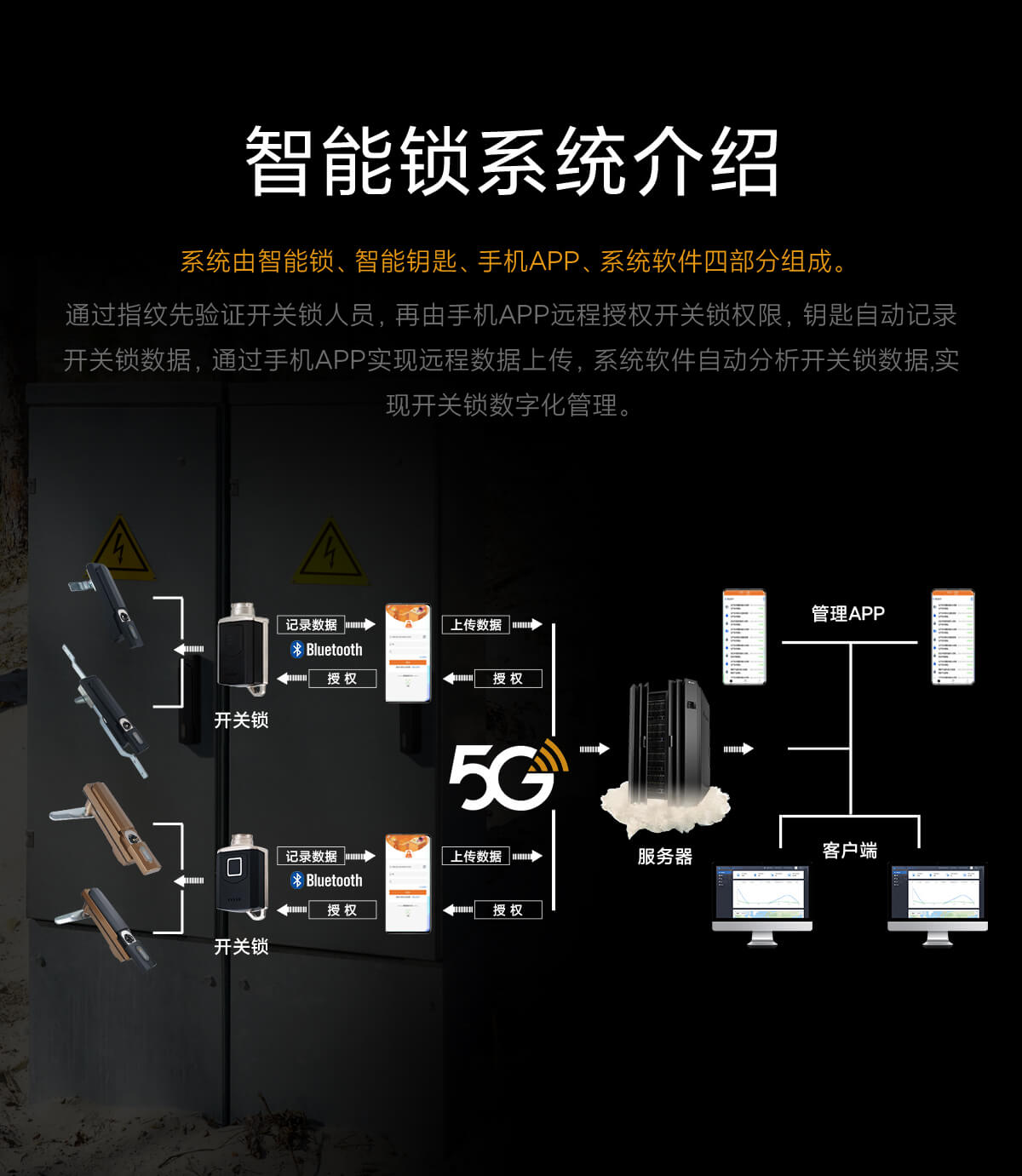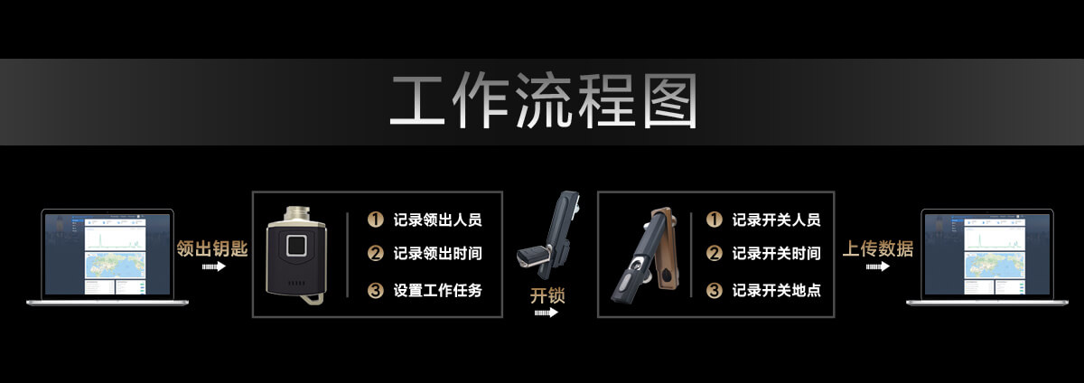 通过指纹先验证开关锁人员,再由手机APP远程授权开关锁权限,钥匙自动记录开关锁数据,通过手机APP实现远程数据上传,系统软件自动分析开关锁数据。实现开关锁数字化管理