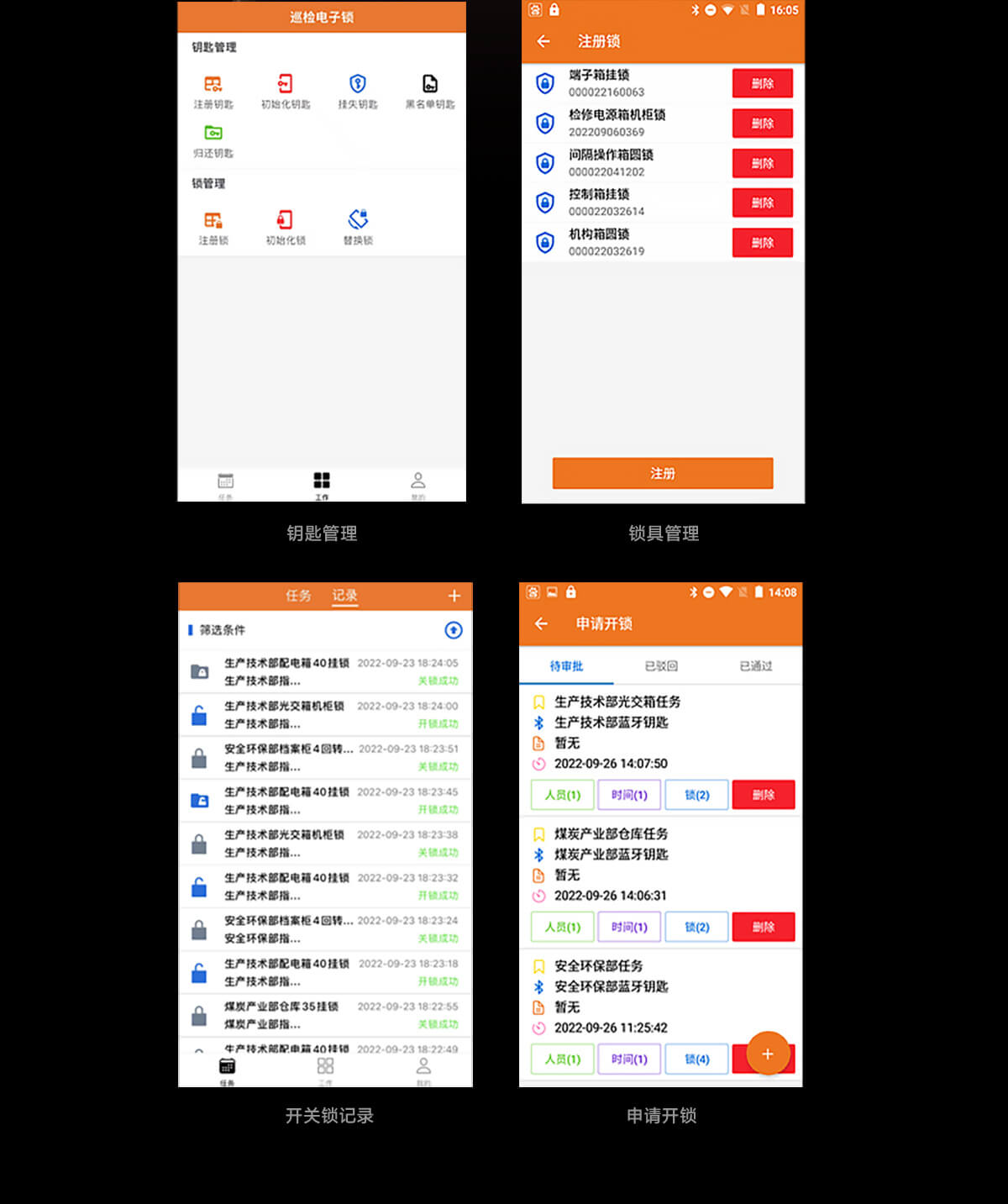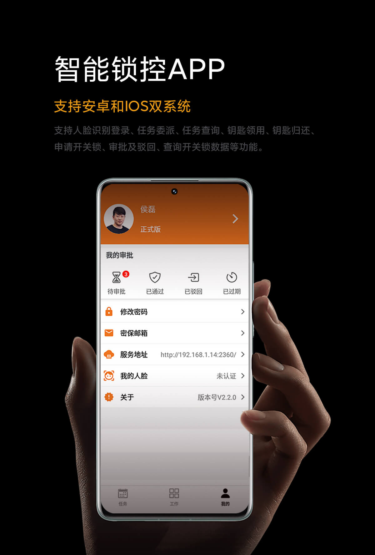 支持人脸识别登录、任务委派、任务查询、钥匙领用、钥匙归还、 申请开关锁、审批及驳回、查询开关锁数据等功能。