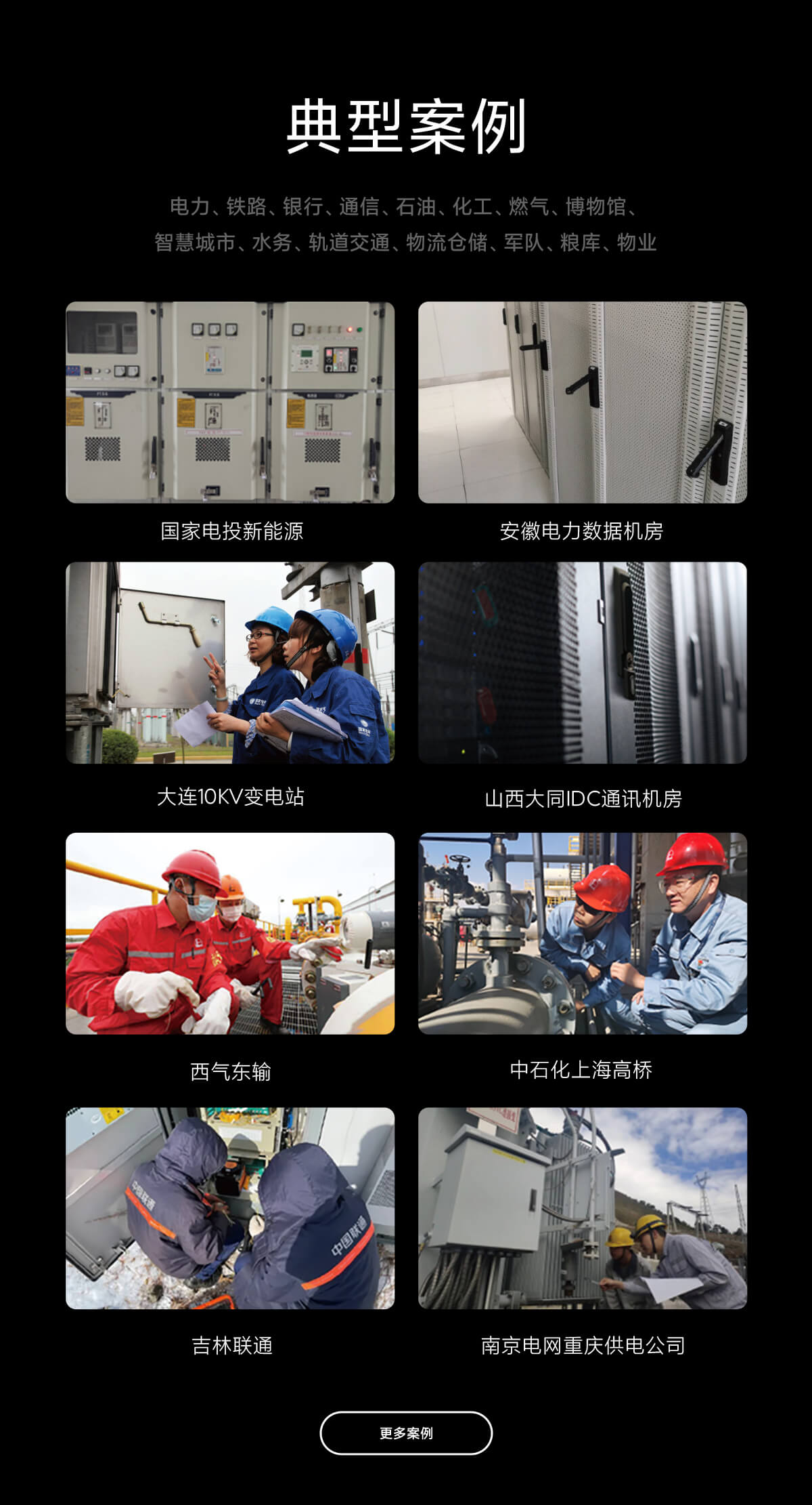 电力、铁路、银行、通信、石油、化工、燃气、博物馆、 智慧城市、水务、轨道交通、物流仓储、军队、粮库、物业