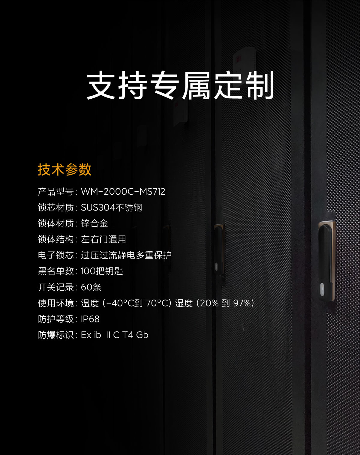 产品型号:WM-2000C-MS712 锁芯材质:SUS304不锈钢 锁体材质:锌合金 锁体结构:左右门通用 电子锁芯:过压过流静电多重保护 黑名单数:100把钥匙 开关记录:60条 使用环境:温度(-40°C到 70°C)湿度(20% 到 97%) 防护等级:IP68 防爆标识:Ex ib ⅡC T4 Gb