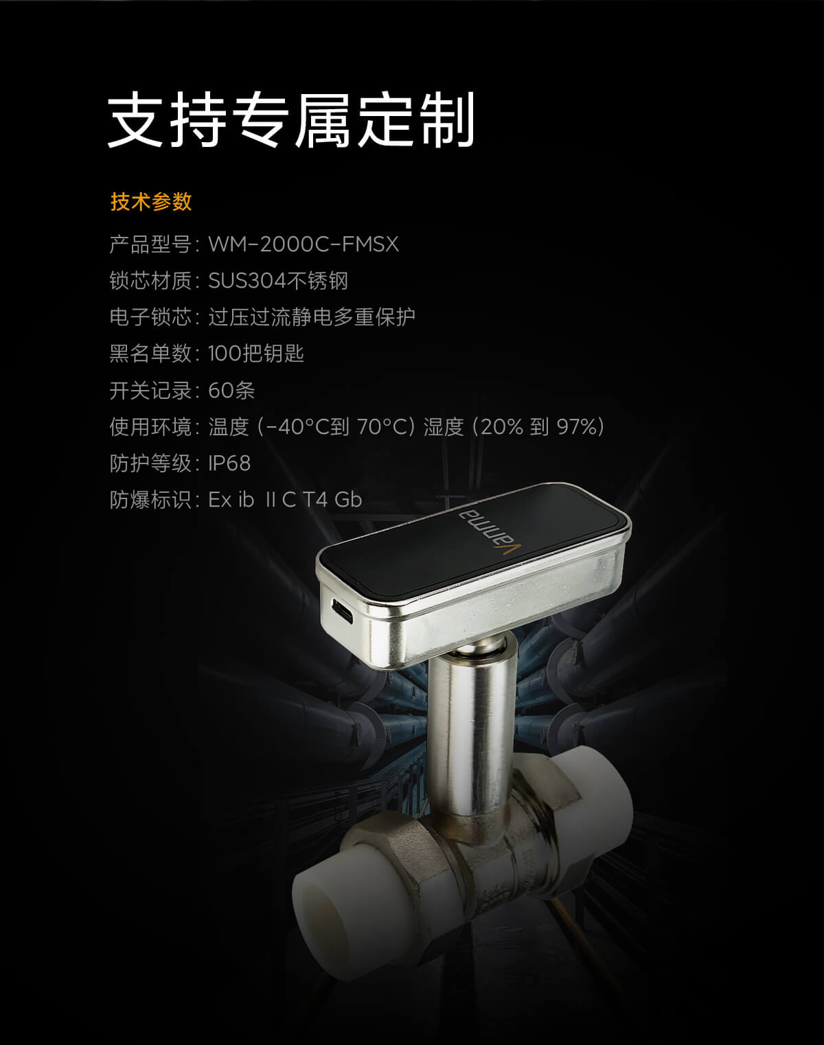 产品型号:WM-2000C-FMSX 锁体材质:SUS304不锈钢 电子锁芯:过压过流静电多重保护 黑名单数:100把钥匙 开关记录:60条 使用环境:温度(-40°C到 70°C)湿度(20% 到 97%) 防护等级:IP68 防爆标识:Ex ib ⅡC T4 Gb
