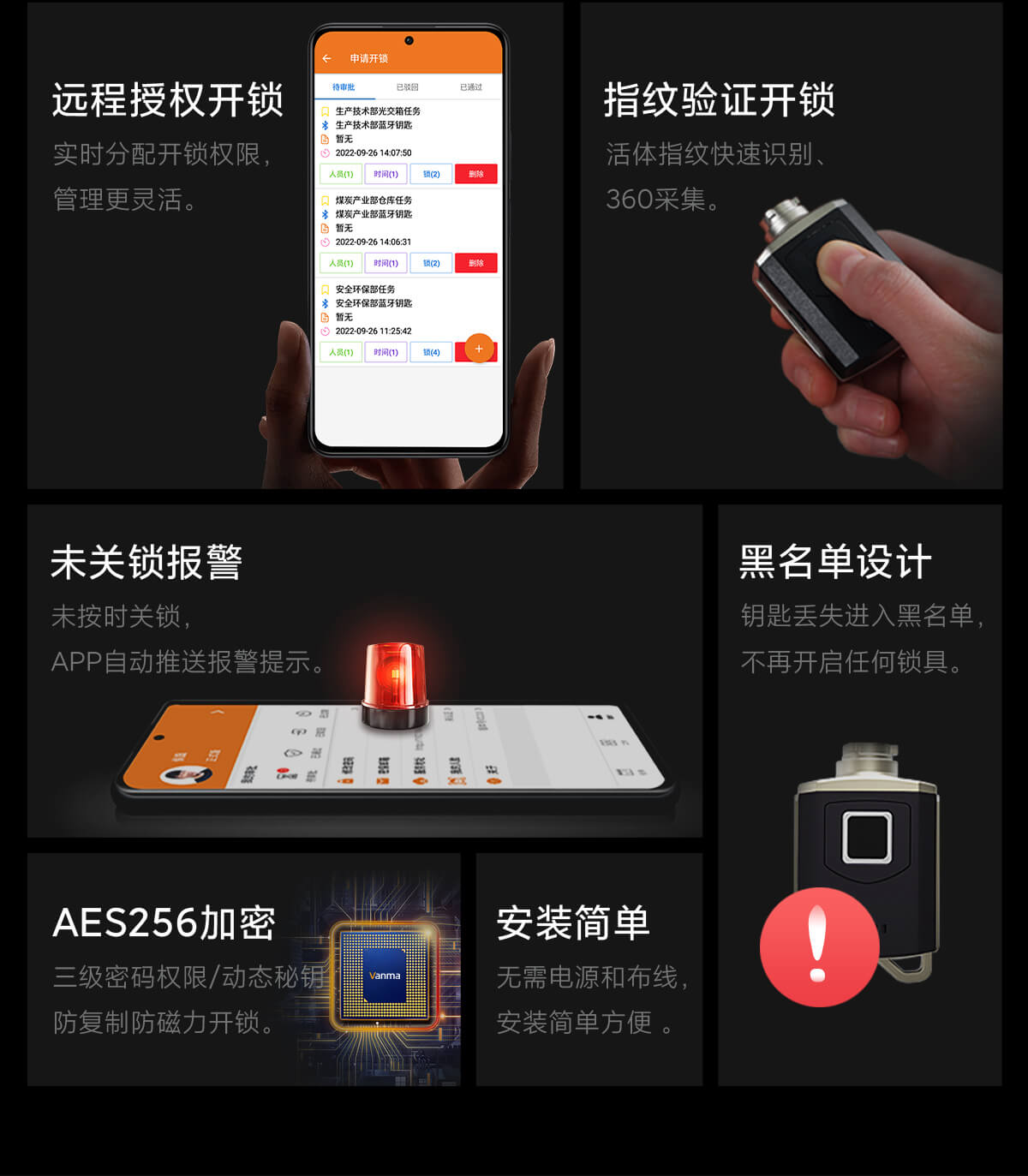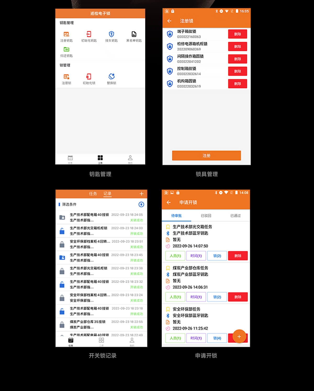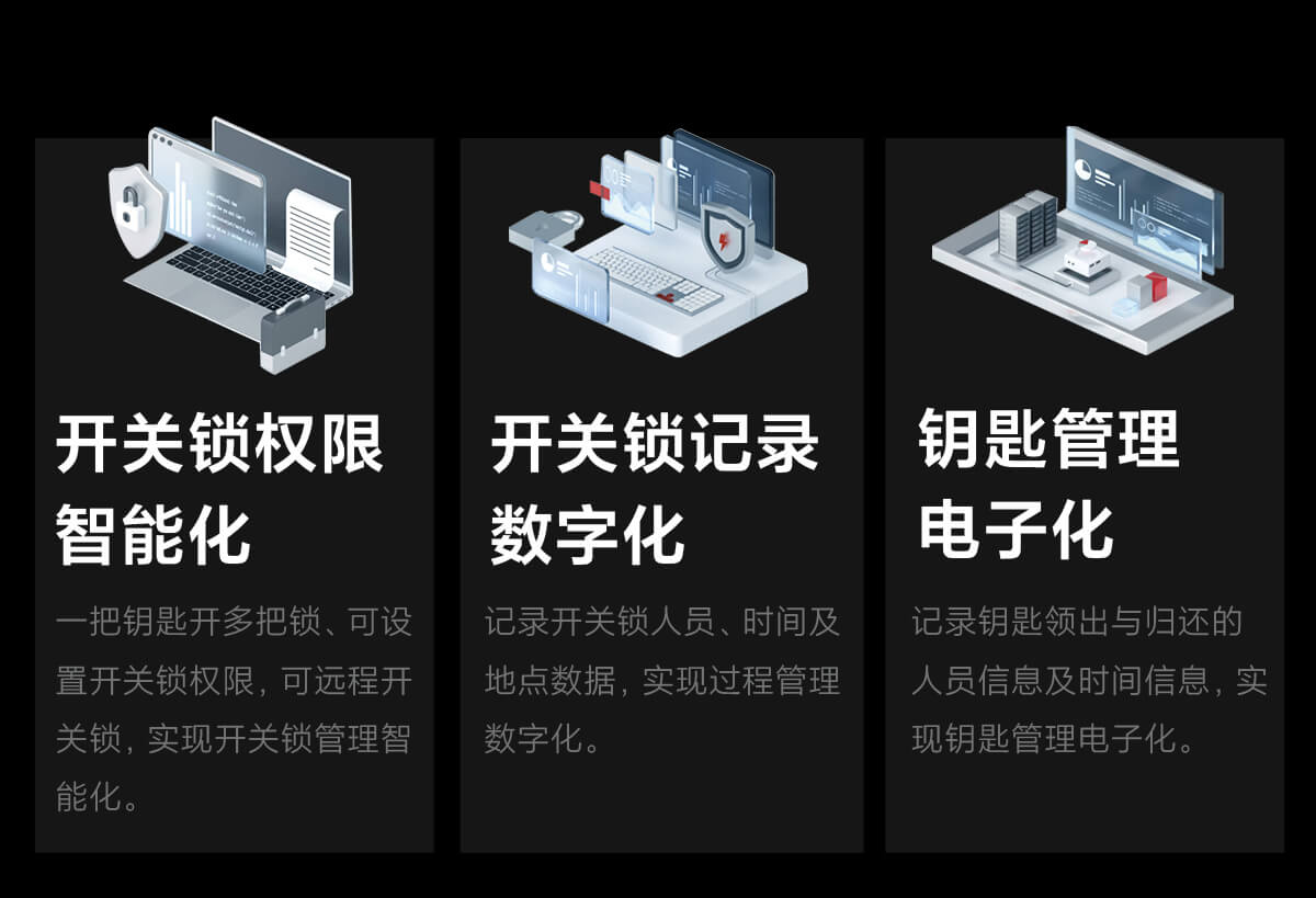 支持人脸识别登录、任务委派、任务查询、钥匙领用、钥匙归还、 申请开关锁、审批及驳回、查询开关锁数据等功能。