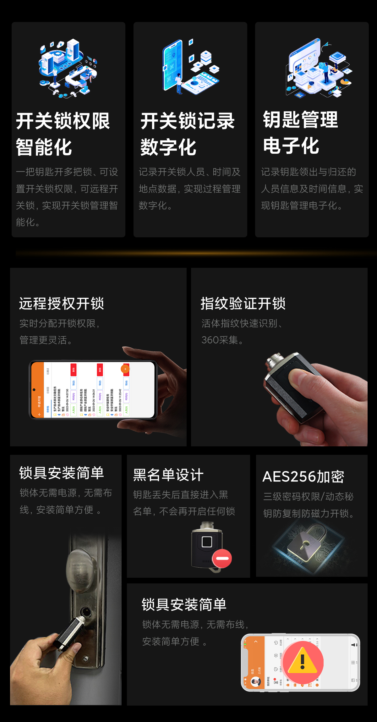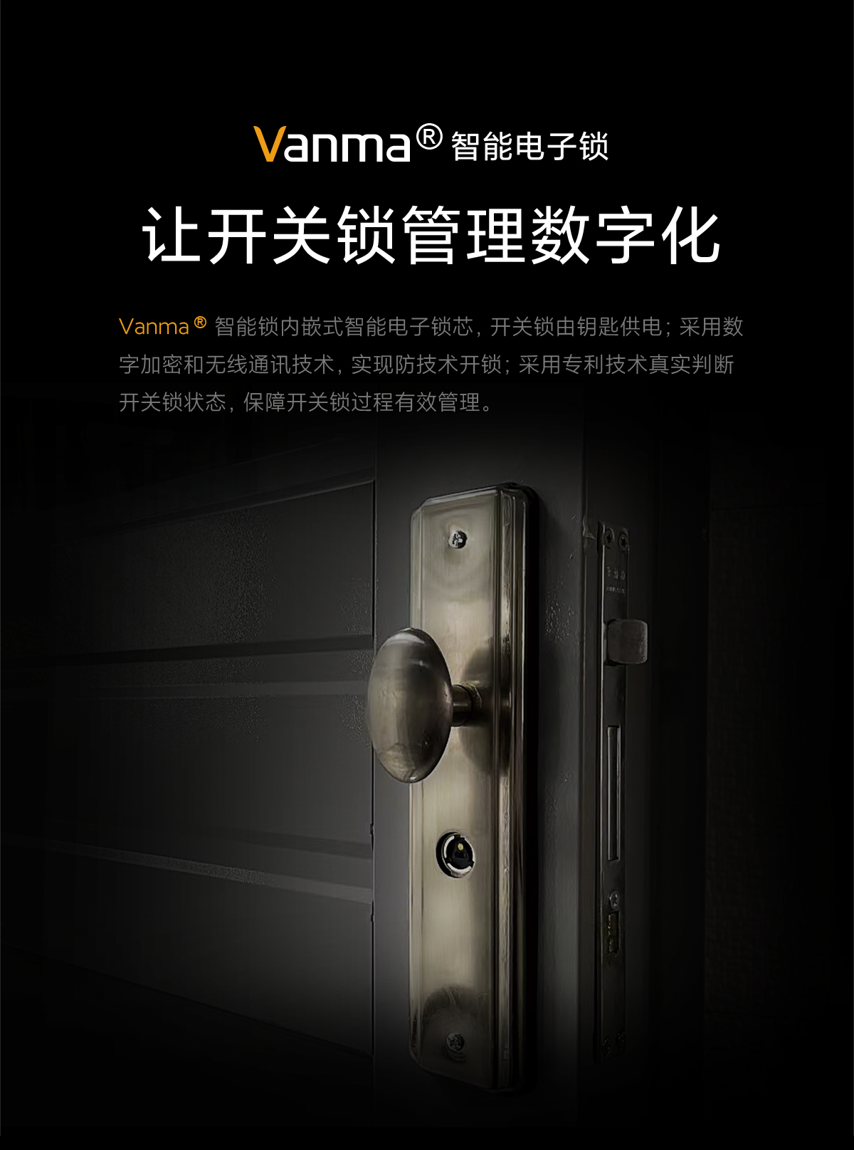 Vanma®智能锁内嵌式智能无源电子锁芯,开关锁由钥匙供电;采用数字加密和无线通讯技术,实现防技术开锁;采用专利技术真实判断开关锁状态,保障开关锁过程有效管理。