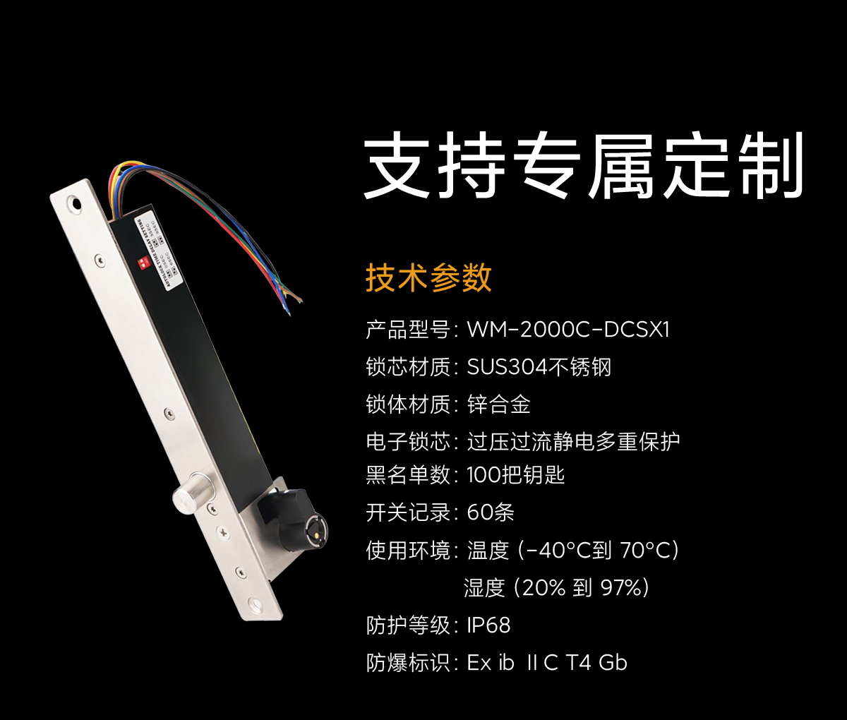 产品型号:WM-2000C-DCSX1 锁体材质:SUS304不锈钢 锁体材质:锌合金 表面处理:不锈钢本色拉丝 电子锁芯:过压过流静电多重保护 黑名单数:100把钥匙 开关记录:60条 使用环境:温度(-40°C到 70°C)湿度(20% 到 97%) 防护等级:IP68 防爆标识:Ex ib ⅡC T4 Gb