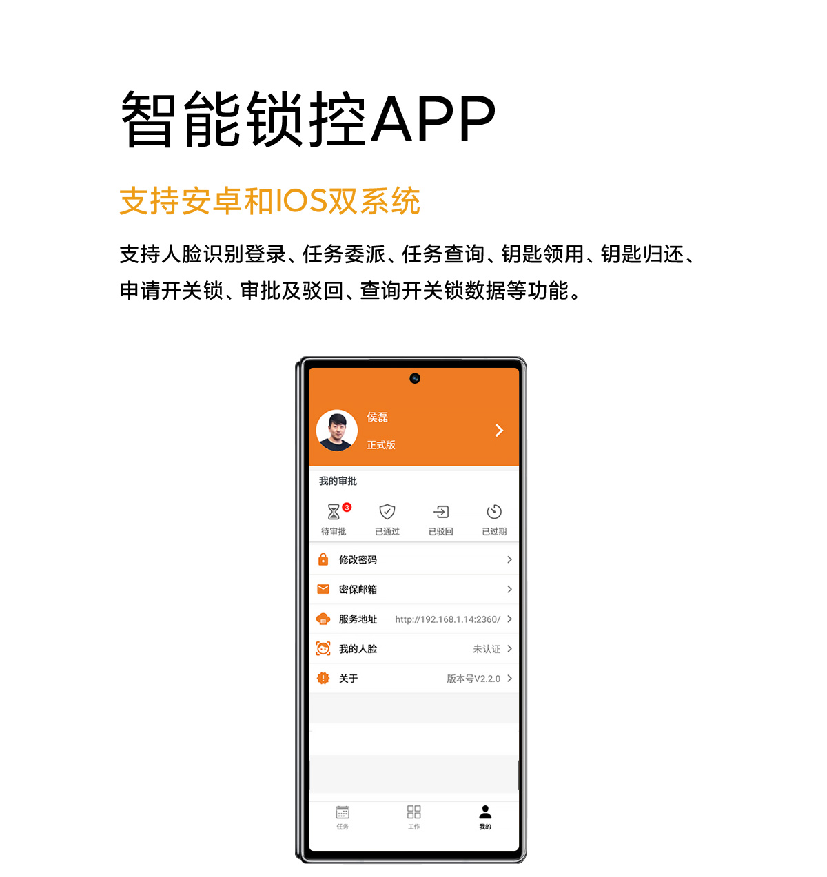支持人脸识别登录、任务委派、任务查询、钥匙领用、钥匙归还、