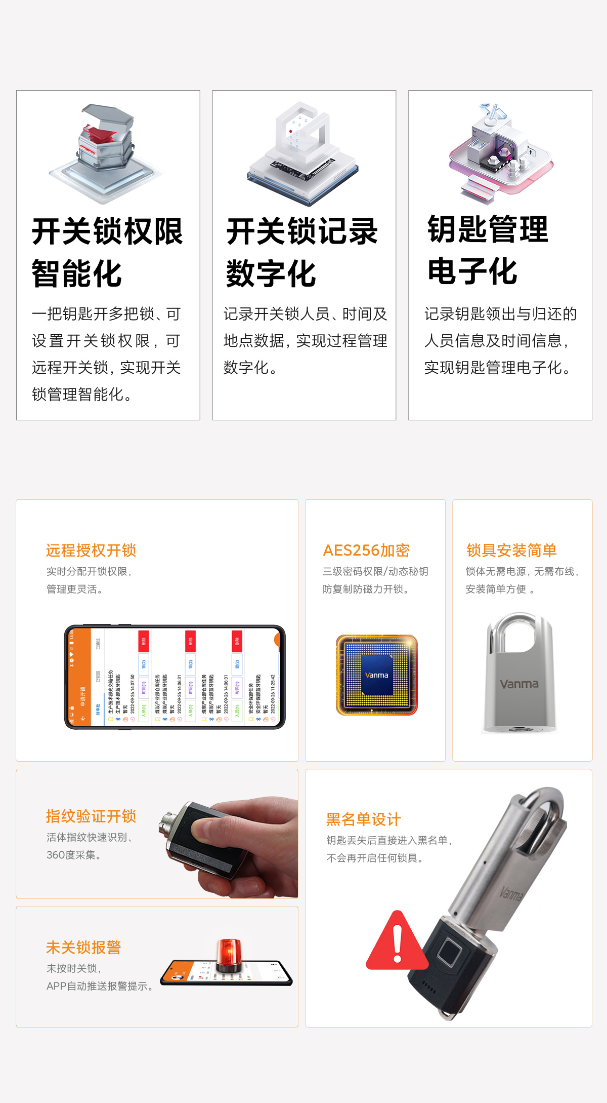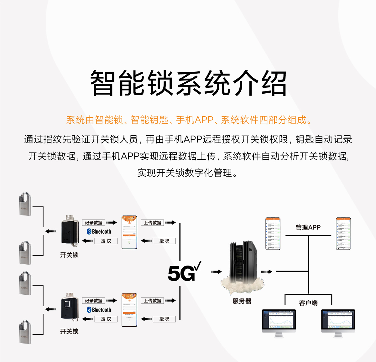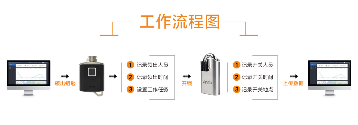 通过指纹先验证开关锁人员,再由手机APP远程授权开关锁权限,钥匙自动记录开关锁数据,通过手机APP实现远程数据上传,系统软件自动分析开关锁数据。实现开关锁数字化管理