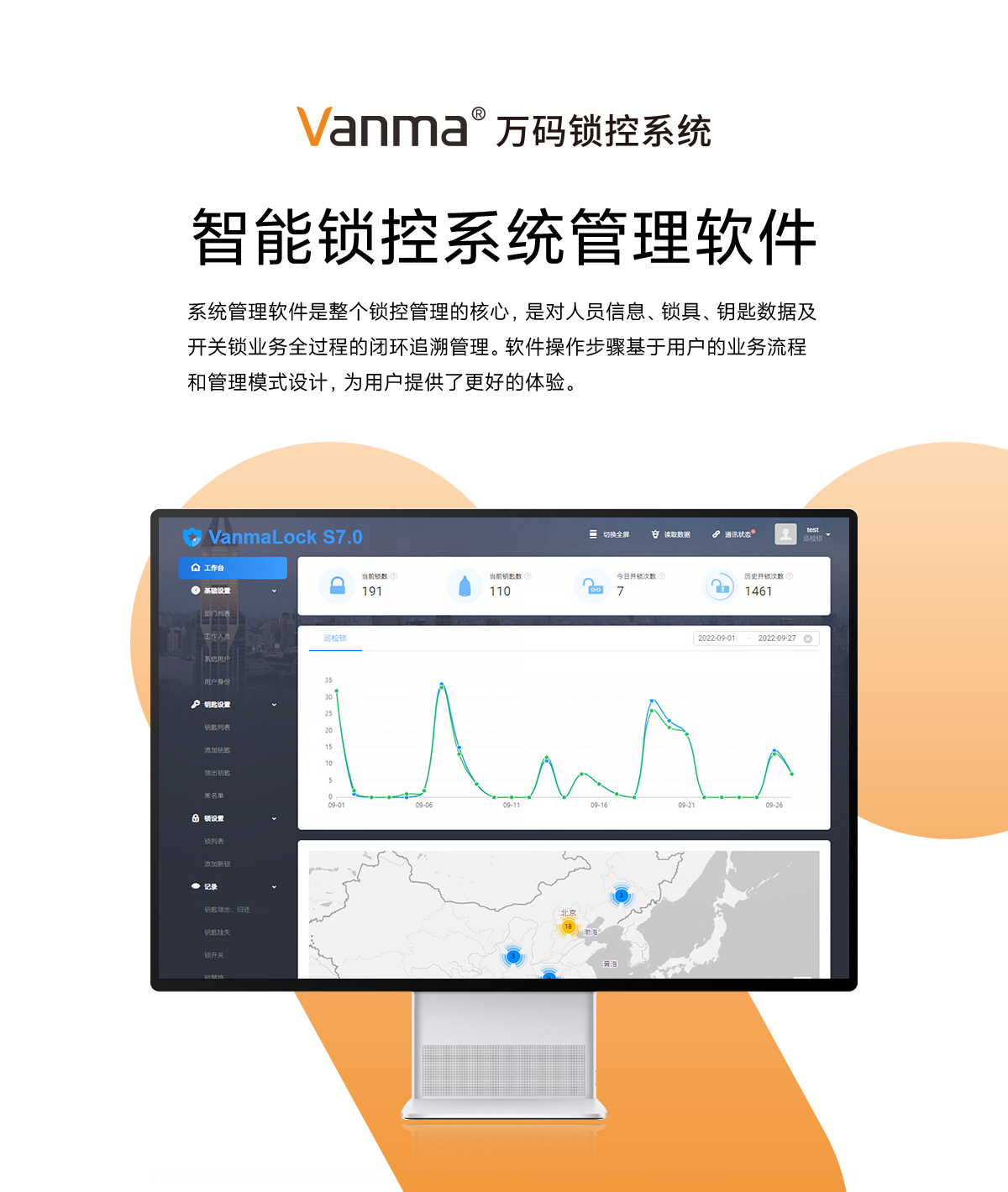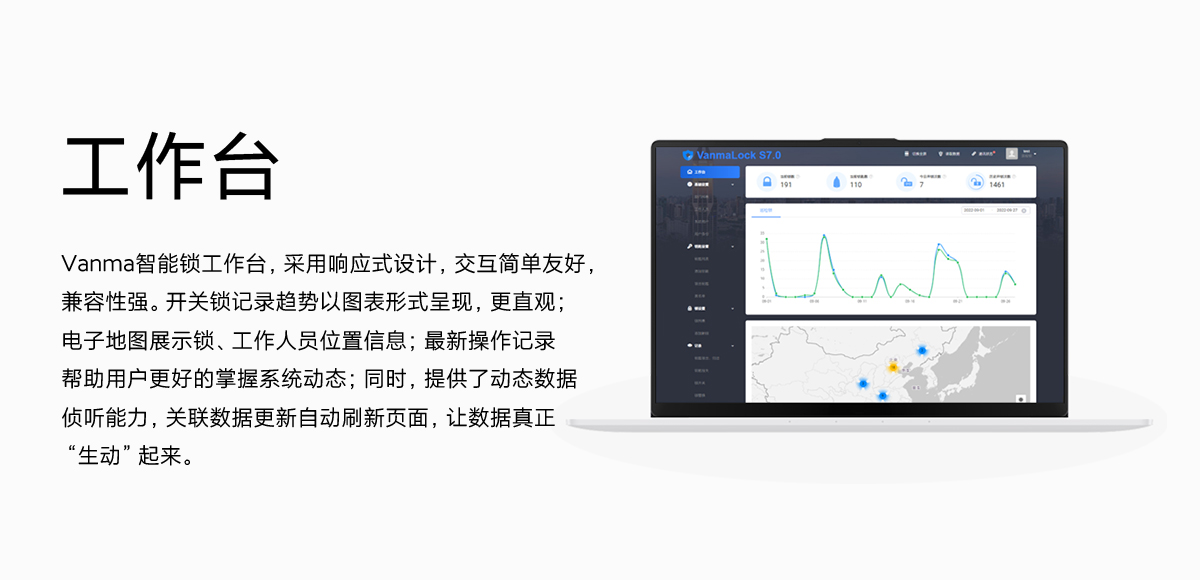 Vanma智能锁工作台,采用响应式设计,交互简单友好,兼容性强。开关锁记录趋势以图表形式呈现,更直观;电子地图展示锁、工作人员位置信息;最新操作记录帮助用户更好的掌握系统动态;同时,提供了动态数据侦听能力,关联数据更新自动刷新页面,让数据真正”生动“起来。