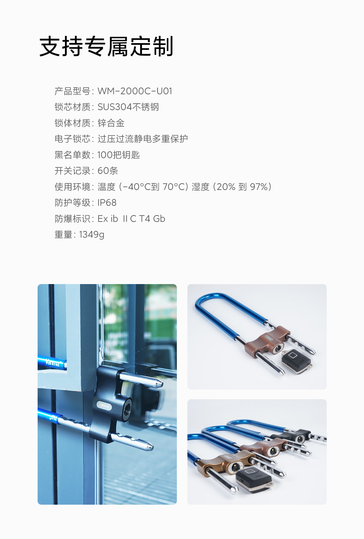 产品型号:WM-2000C-U01 锁芯材质:SUS304不锈钢 锁体材质:锌合金 锁梁材质:45号钢 电子锁芯:过压过流静电多重保护 黑名单数:100把钥匙 开关记录:60条 使用环境:温度(-25°C到 70°C)湿度(20% 到 95%) 防护等级:IP68 防爆标识:Ex ib ⅡC T4 Gb 锁具重量:1349g