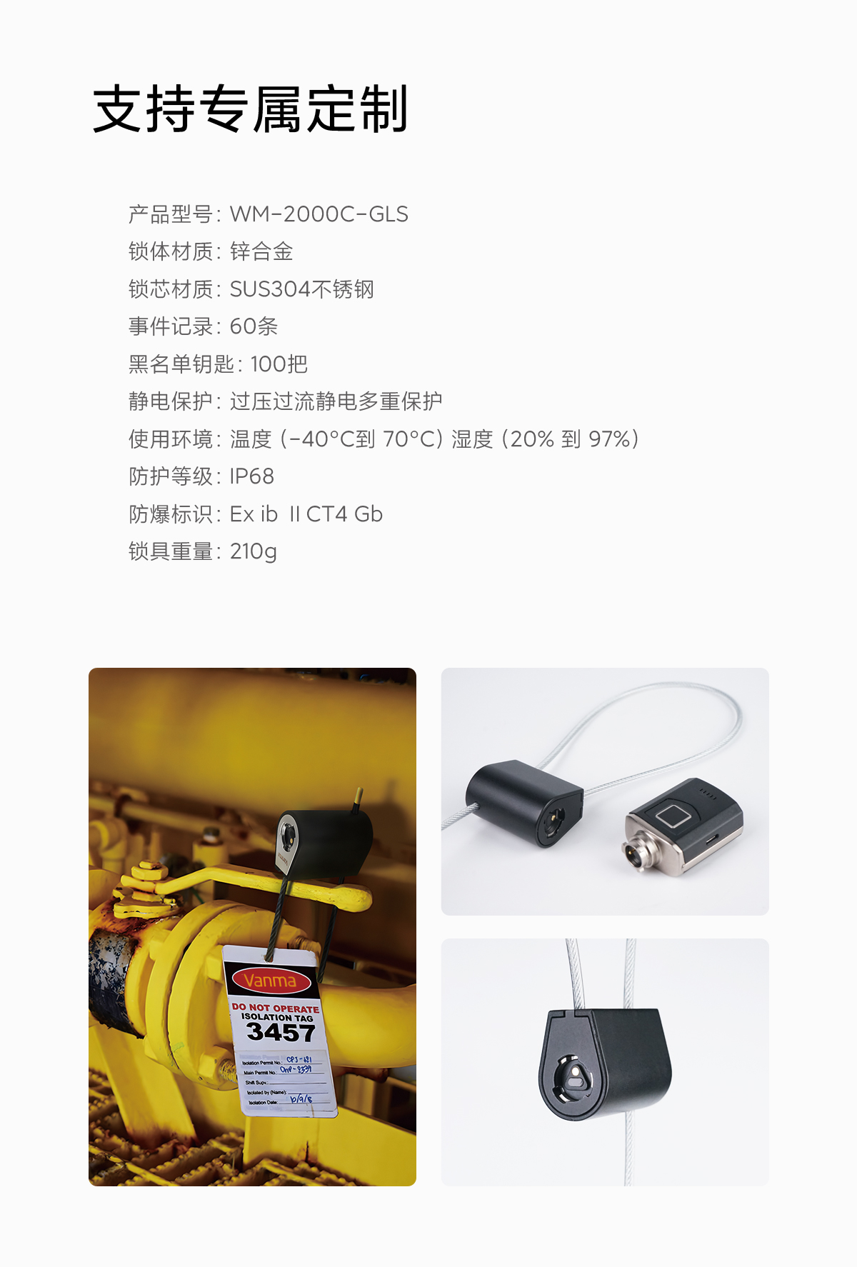 产品型号:WM-2000C-GLS 锁体材质:锌合金 锁芯材质:SUS304不锈钢 事件记录:60条 黑名单数:100把钥匙 静电保护:过压过流静电多重保护 使用环境:温度(-25°C到 70°C)湿度(20% 到 95%) 防护等级:IP68 防爆标识:Ex ib ⅡC T4 Gb 锁具重量:210g