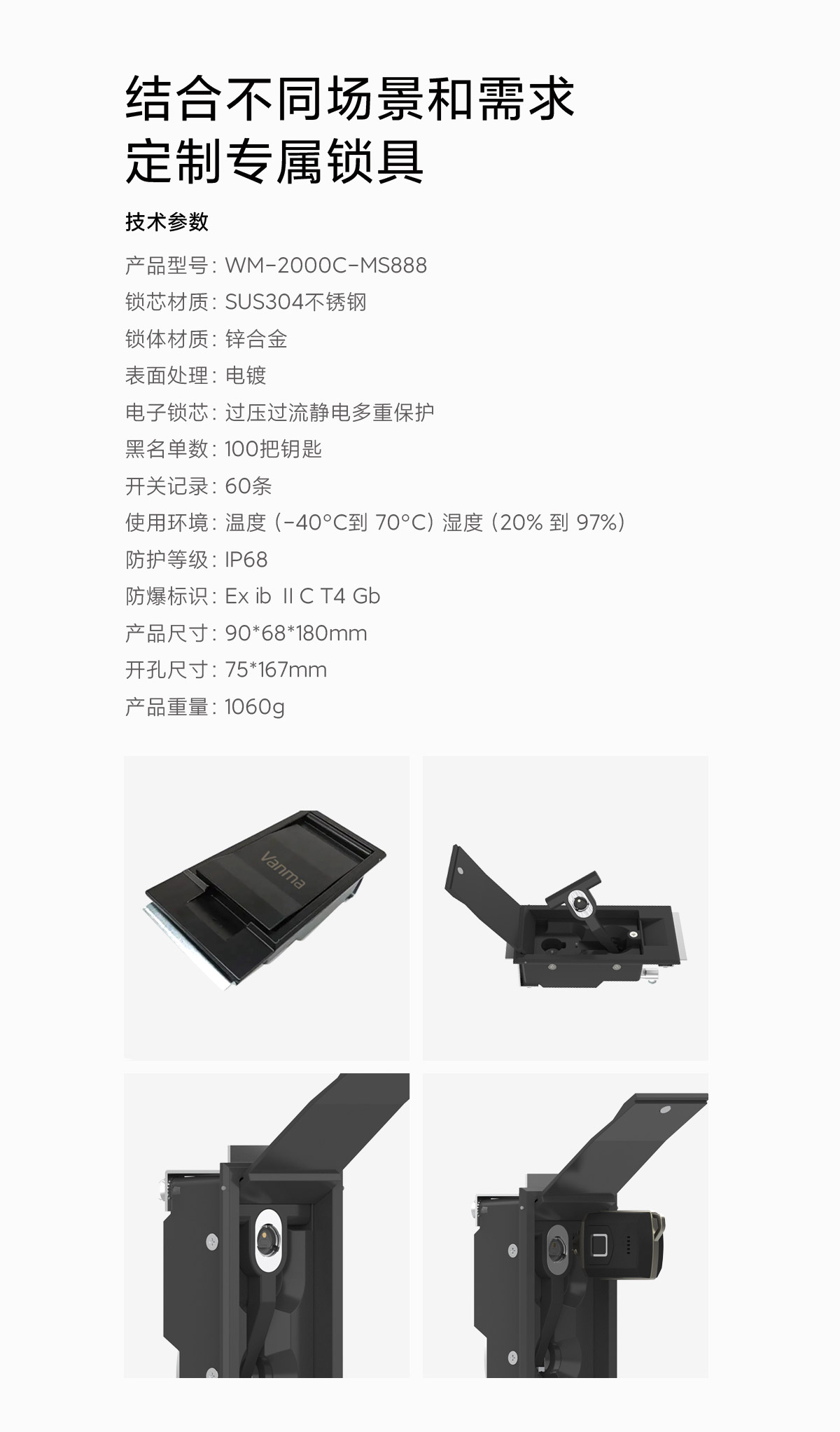产品型号:WM-2000C-MS888 锁芯材质:SUS304不锈钢 锁体材质:锌合金 电子锁芯:过压过流静电多重保护 黑名单数:100把钥匙 开关记录:60条 使用环境:温度(-25°C到 70°C)湿度(20% 到 95%) 防护等级:IP68 防爆标识:Ex ib ⅡC T4 Gb 产品尺寸:90*68*180mm 开孔尺寸:75*167mm 产品重量:1060g